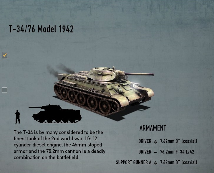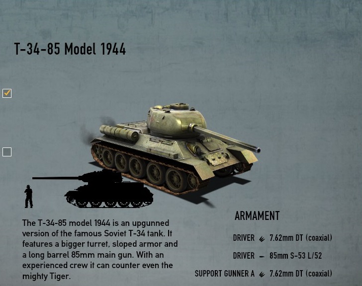 APCRを装備してもパンターに正面から正面装甲90mmに有効打を与えることは現在不可能である。アメリカのE8に対してはAPCRで遠距離からでも正面を貫通できるようになるため、その点ではT-34-76よりは優っていると認識することはできる。 T-34-85は、ドイツとの戦闘において前面にティガーⅠやパンターが現れるようになってくると以前までの3号戦車や4号戦車のように76.2mm砲で正面を貫くことができなくなってしまった。(パンターを1両破壊するには側面まで回り込む必要があった。パンター1台を破壊するために10台のT-34-76が必要で、正面から縦列で突っ込み、側面にあたるT-34が生き残れば側面から撃破できる算段であった。これはあまりにも無謀である。) |