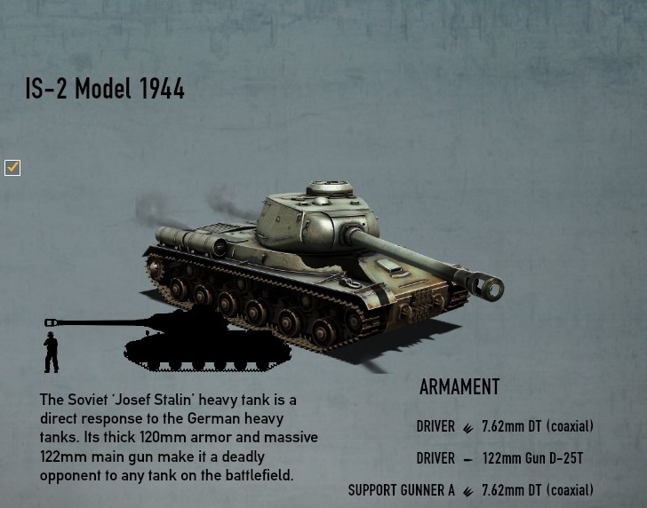 今ゲームにおけるIS-2は唯一ドイツのティーガー2に太刀打ちできる戦車だったが、APCRの追加によってただの鴨になりさがってしまった。こう言っては何だが、アメリカの重戦車よりは依然マシなため、どうしても敵に重戦車がいて拠点を突破できない時のみ出てくる程度になっている。物理的に122mm砲が当たれば装甲がたたき割られそうなものだがティーガー2が出てきたら正面装甲はまず抜けない。側面から周りこんで撃破する必要がある。また、こちらの正面装甲はAPCRが追加されてから簡単に貫通されてしまうので正面であっても安心してはならない。 史実においてドイツの3号や4号戦車にた対し、優位を保っていたKV-1やT-34であったが、パンターやティーガーⅠを戦場に投入するようになると、T-34-85で対抗した。しかし、ティーガーⅠを破壊するには8.8cmの危険領域まで接近する必要があった。そのため開発されたのがIS(JS)-1である。だが、IS-1は搭載していた砲が85mmだったため、すでにT-34-85がある時点で陳腐化してしまった。そこで122mm加農砲を搭載することになり、ここで開発されたのがIS-2である。搭載している122mm砲の榴弾威力は凄まじく、陣地に対する攻撃力は高く、ドイツ軍のティーガーIやパンターなどを十分に撃破しうる性能を秘めていた。たとえ装甲を貫通できなくても、強力な榴弾の爆発が敵の装甲を叩き割ったり、(当時、ニッケルの不足で質が低下していたドイツ戦車の)装甲内壁を飛散させ、乗員を殺傷することができた。そのため大量に生産され、対独戦末期の重要な局面に投入され大活躍した。実際には用途として砲撃による拠点破壊や、市街地によって使用されたため、その多くはパンツァーファウストによって撃破されている。 |