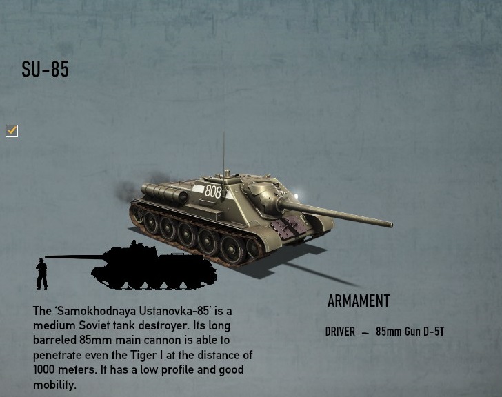 APCRによりある程度の火力は確保できたが、3勢力中最も使い辛い駆逐戦車であることには変わりない、アップデートより装甲値が強化されたなどあるが、それはパンターに乗り換えた戦車兵がAPで傾斜装甲もちのSU-85に撃ち込んだことによる迷信である可能性が高い、つまり依然として最弱である。また、歩兵の数が少ないソ連はいまだに戦車最大の敵は纏わりつく敵歩兵である。