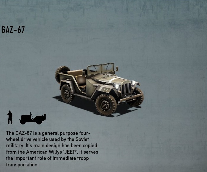 GAZ-67はGAZ-64の改良型であり、強化シャーシフレーム及び燃料タンクの拡大など、以前までの汎用四輪駆動軍用車両に比べると格段に扱いやすくなっていた。 |