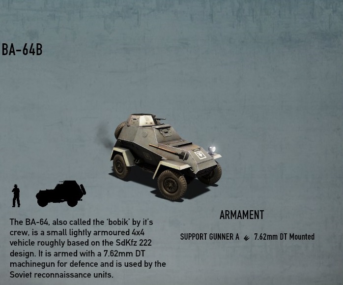 BA-64Bは武装が7mm対人機銃なので基本対装甲車両には向いていない。 |