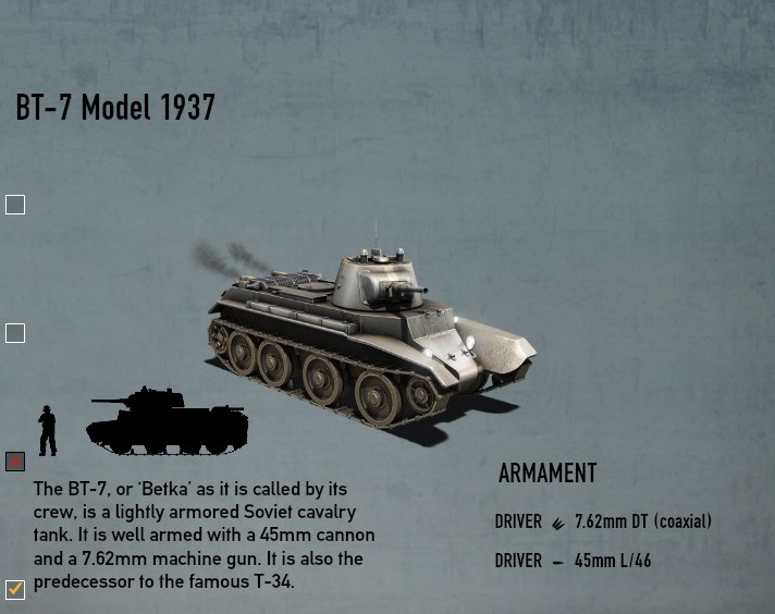 この戦車最大の利点は正面装甲とその小ささで、BT-7に比べるとかなり小さい。 |