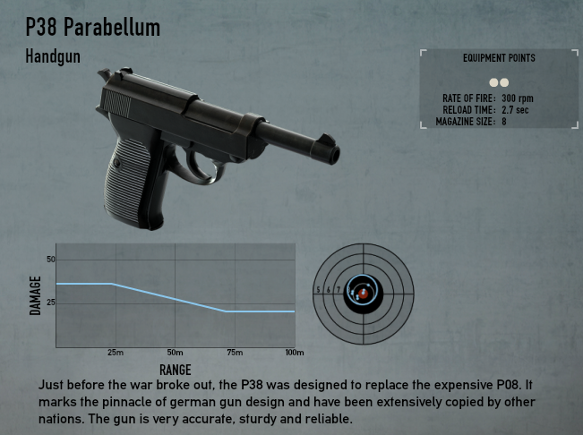 装備ポイント消費が少ない対人用ピストル。戦車兵にスパナと一緒に持たせたり、狙撃銃のお供にと意外と使い道は多い。