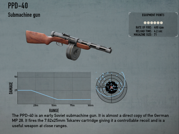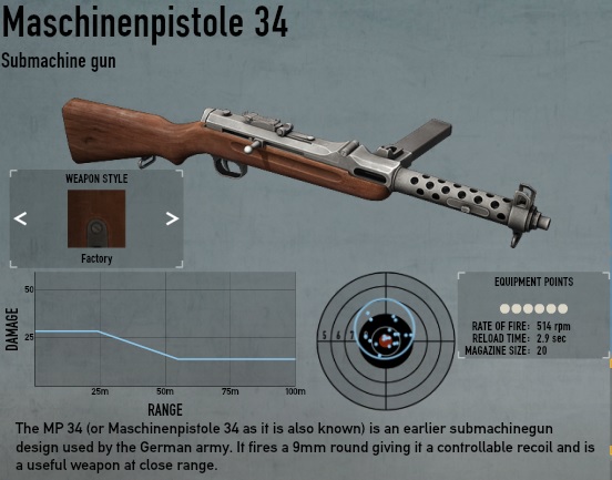 これを買うにはInfantry Assaltリボンを最大まで上げる必要があり、かなり時間がかかるため購入までが困難。 まず、威力もそこそこあることから近距離戦闘は難なくこなす事が可能。 以上のことから、20万も掛けるならもう少し安いMP40などを購入したほうが良い場合もある。 上記のような性能だが意外と使ってる人は多く人気がないわけではない。少なくともソ連の某武器よりはよく見かける。 |